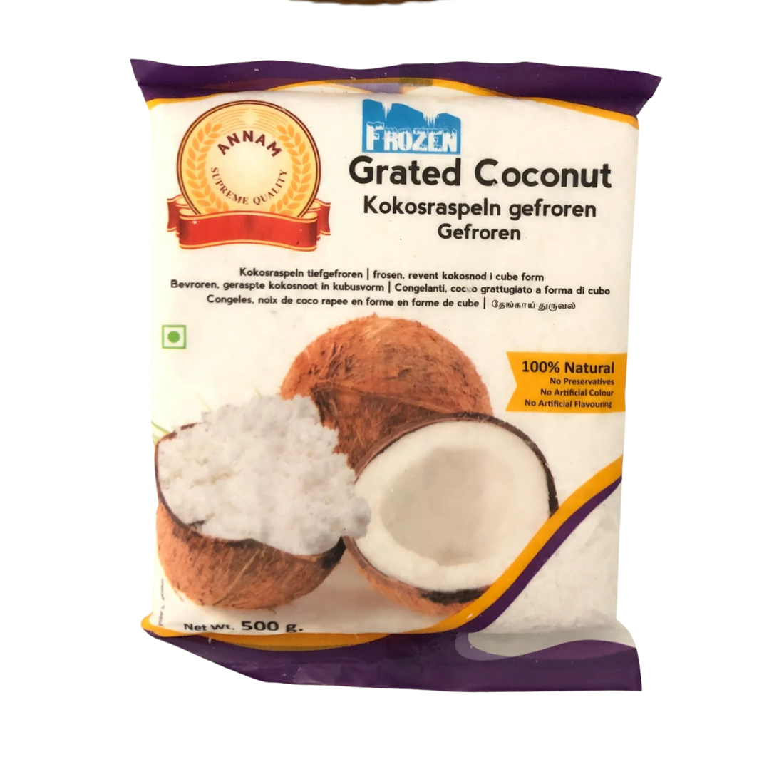 100% natural frozen grated coconut made from fresh coconuts. No preservatives or artificial additives. Ideal for Indian cooking, desserts, curries, and chutneys.