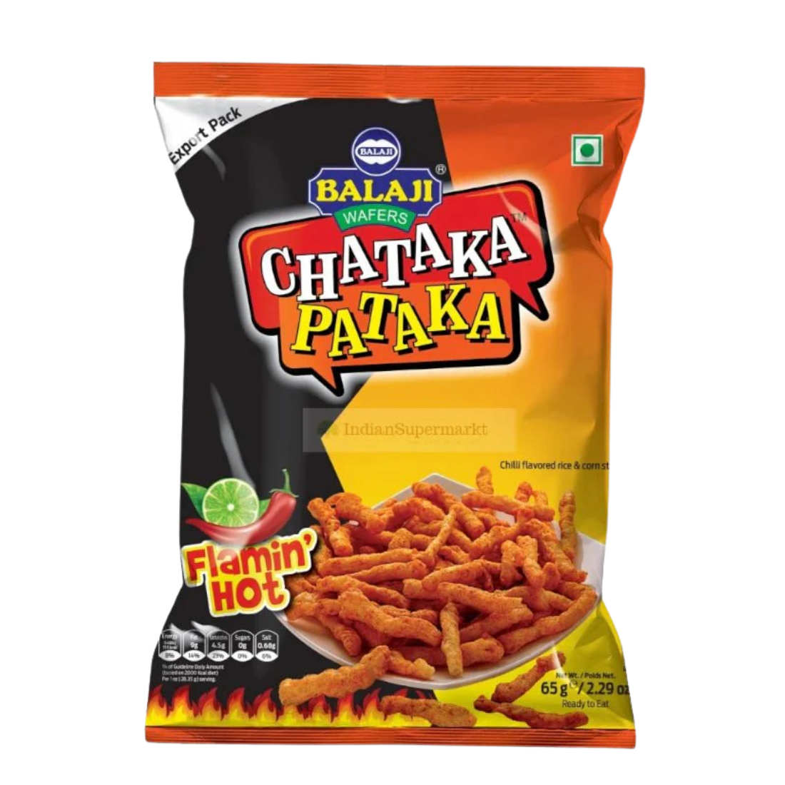 Balaji Wafers Chataka Pataka Flamin’ Hot 65GM offers a bold and fiery snacking experience with its spicy, crunchy sticks. Made from quality ingredients and seasoned with a strong chilli blend, this snack delivers an intense heat and satisfying crunch loved by spice enthusiasts. The 65GM pack is ideal for quick breaks, travel snacking, or pairing with beverages. Freshly packed to maintain crispness, it brings a flavorful and enjoyable spicy kick suitable for customers who prefer hot and vibrant snacks.
