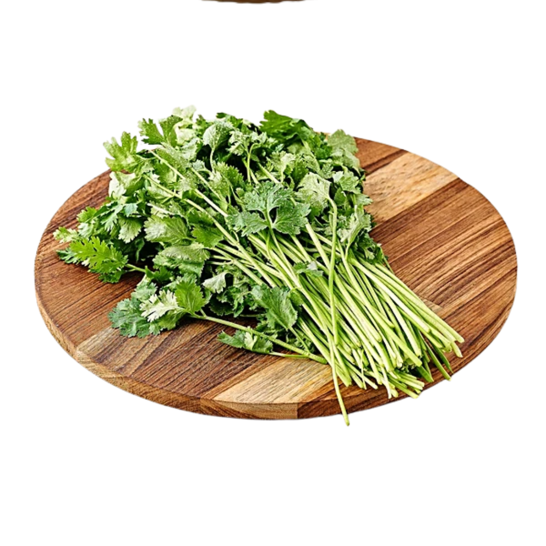 Fresh green coriander leaves used for garnishing and flavouring dishes. Adds aroma and freshness to meals.
