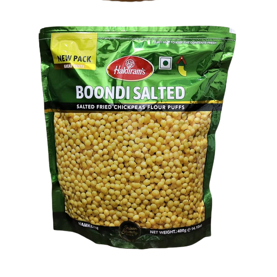 Haldiram Boondi Salted features crispy gram flour pearls lightly seasoned with salt. It is ideal for snacking, garnishing raita, or enhancing the texture of various Indian dishes.