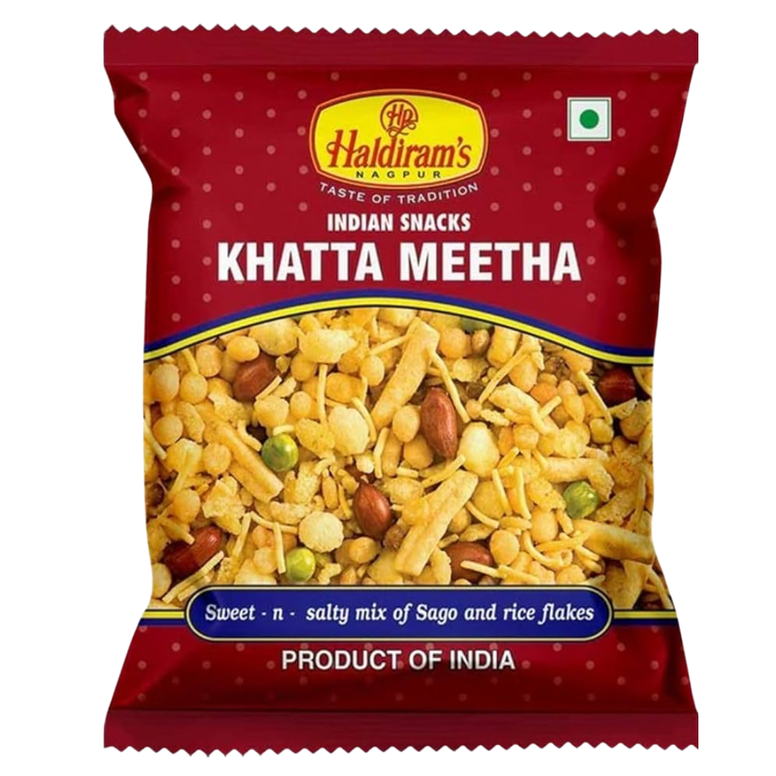 Haldiram Khatta Meetha is a sweet and tangy snack mix made with lentils, peanuts, and raisins. It offers a balanced flavor profile and crunchy texture for enjoyable snacking.