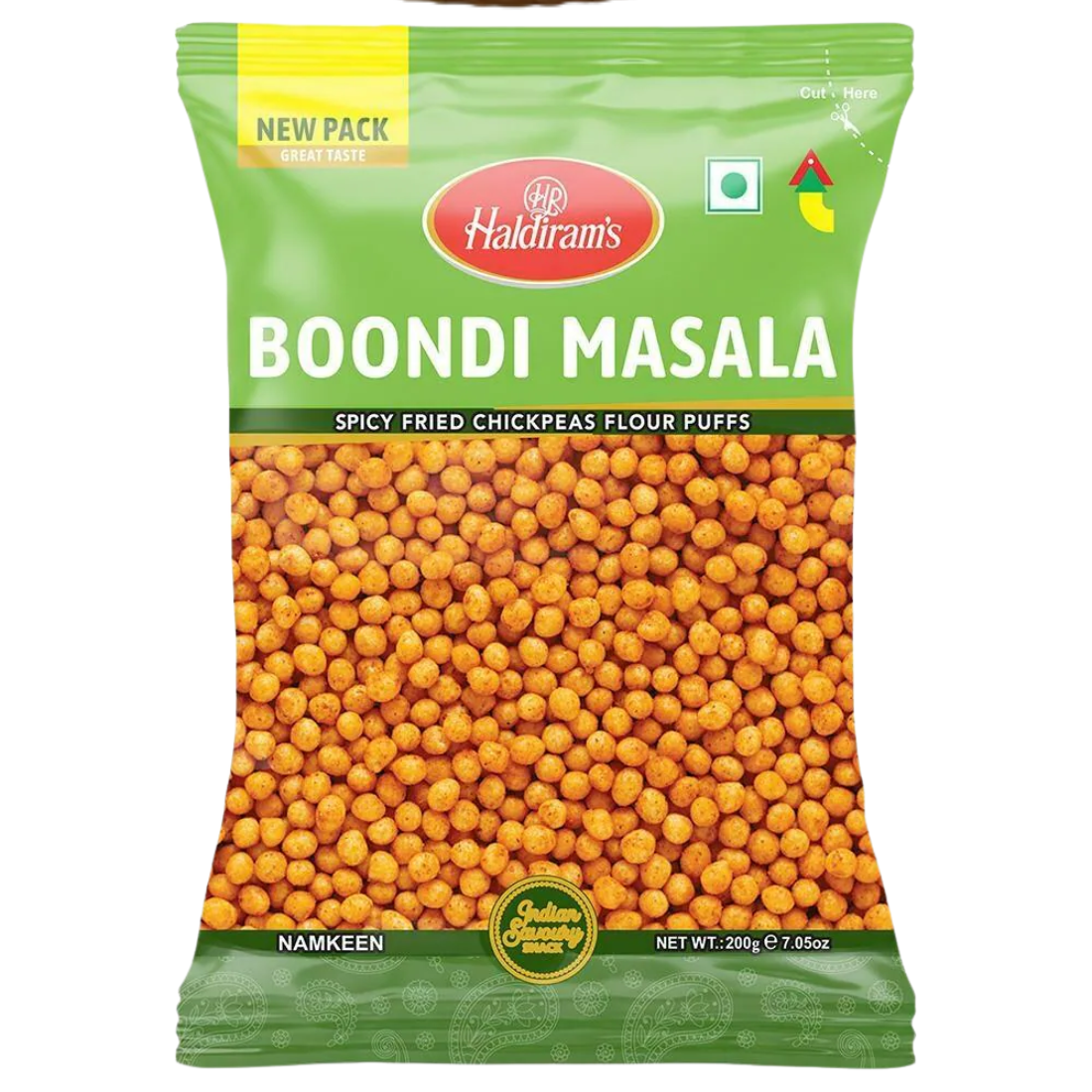 Haldiram Masala Boondi is made from fine gram flour pearls seasoned with aromatic spices. Crispy and flavorful, it can be enjoyed on its own or used as a topping for chaats and traditional Indian dishes.