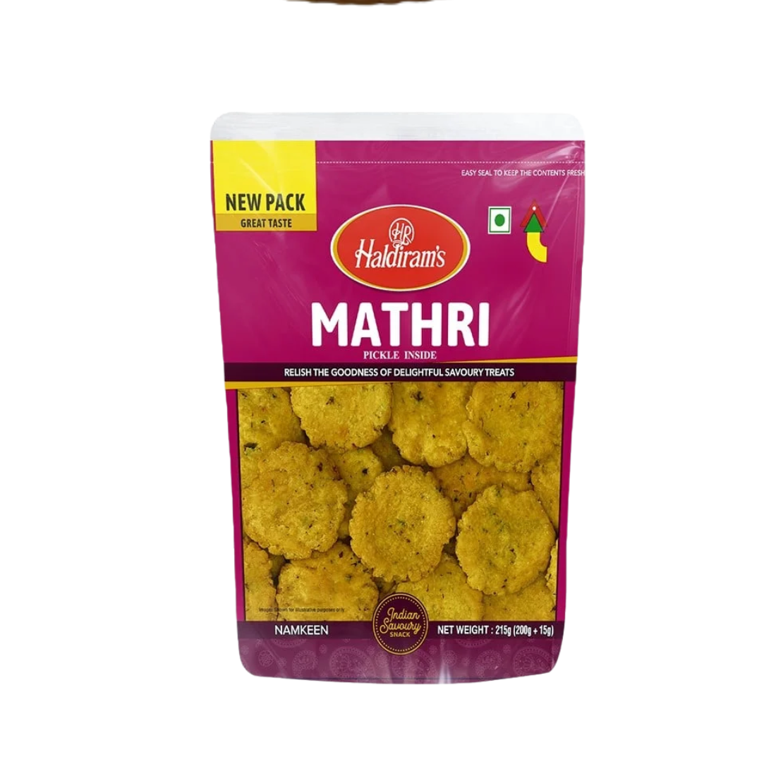 Haldiram Mathri is a classic Indian savory biscuit made from flour and spices. Crisp and flavorful, it pairs well with tea and is suitable for long-lasting snacking.