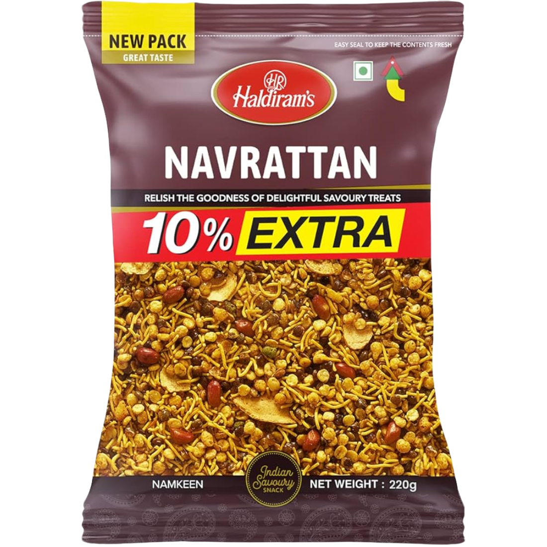 Haldiram Navrattan Mix is a premium snack blend featuring lentils, nuts, and dried fruits. Rich in texture and taste, it is ideal for special occasions and everyday enjoyment.