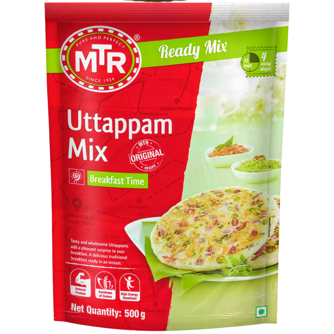 Easy-to-use uttappam mix suitable for preparing thick, soft uttappams. Ideal for breakfast or light meals.